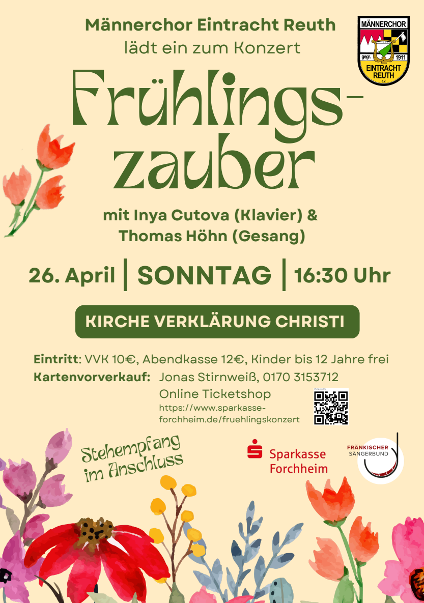 Frühlingszauber in der Kirche Verklärung Christi - Der Forchheimer Bariton Thomas Höhn, die hoch ausgezeichnete junge Pianistin Inya Cutova aus Rumänien und unser Männerchor Eintracht Reuth, langjähriger Leistungschor im Fränkischen Sängerbund, lassen den Frühling in diesem klassischen Konzert in seinen schönsten Farben erblühen. Der Dino-Lipatti-Wettbewerb zeichnete die Pianistin Inya Cutova 2025 in Bukarest als beste rumänische Pianistin aus: Somit kann sie als Jungstar ihres Landes bezeichnet werden.
